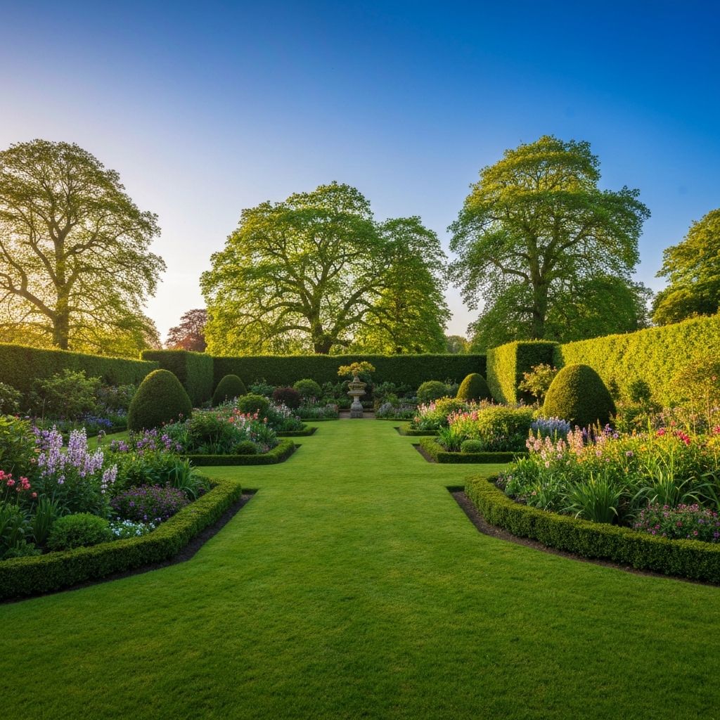 Regular garden upkeep including lawn mowing, hedge trimming, weeding, and seasonal care